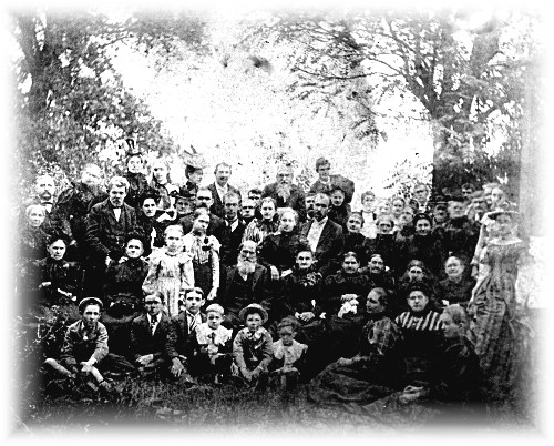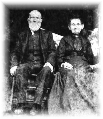 Golden Wedding 1849 September 10 1889 Nancy Cain to Samuel Sanders "You to a love that your true Faith doth merit". Quite a novelty was the bride's cake prepared by Miss Pernie Musgrove. It was of course, pure white daintily trimmed with arbor vitoe around the sides, while from the top there peeped more than a dozen ends of golden ribbon. After the bride had cut the cake, there was much merriment over the pulling of these ribbons, to the hidden ends of which were attached symbols indicating the wedding that would be attained by the fortune seeker, whether paper, cotton, wooden, leather, tin, crystal, silver, ruby, golden, or diamond, or whether a lack-a-day, lone spinsterdom awaited, or sad widowhood, or crusty batchelorhood. During the cutting of the cake Miss Francilla Huley gave the "Irish Woman's very Amusing Recipe for cake". Rev. J. I. Williams recited "Grin and Endure It", read "Noah's Wife," and as an encore, told a funny story about "Bill". Prof. Ira Robins described two phases of courtship as he had experienced it in his youth, and Miss Bessie Huley read Sydney Lanier's beautiful "Golden Wedding" written for his grandparents, but just as appropriate to these. "Two hearts that wrought with smiles through tears. This Rainbow span of fifty years". Another enjoyable feature of the occasion was the spirited Fa Sol La singing by the young men and maidens of fifty years ago; and throughout the afternoon and evening sweet music on the mandolin and guitar was furnished by Misses Gay Long, Mary and Francilla Huley. The belle of the occasion was Mrs. Barton, who, with her hair in a beaded net and wearing a handsome silk dress, white clocked stockings and low slippers of her girlhood, looked as if she had stepped out of an old time fashion plate. She was the admiration of all the "boys" from 1848 to 1898 and the envy of all the "girls" of the same period. Early in the afternoon, Mrs. J. B. Hughes took the picture of the bride and groom and also of the entire company assembled on the lawn. Mr. and Mrs. Sanders received a number of appropriate presents in gold and it's semblance, sand many are the loving wishes that follow them as they journey hand in hand from their Golden Wedding to the Golden Shore.