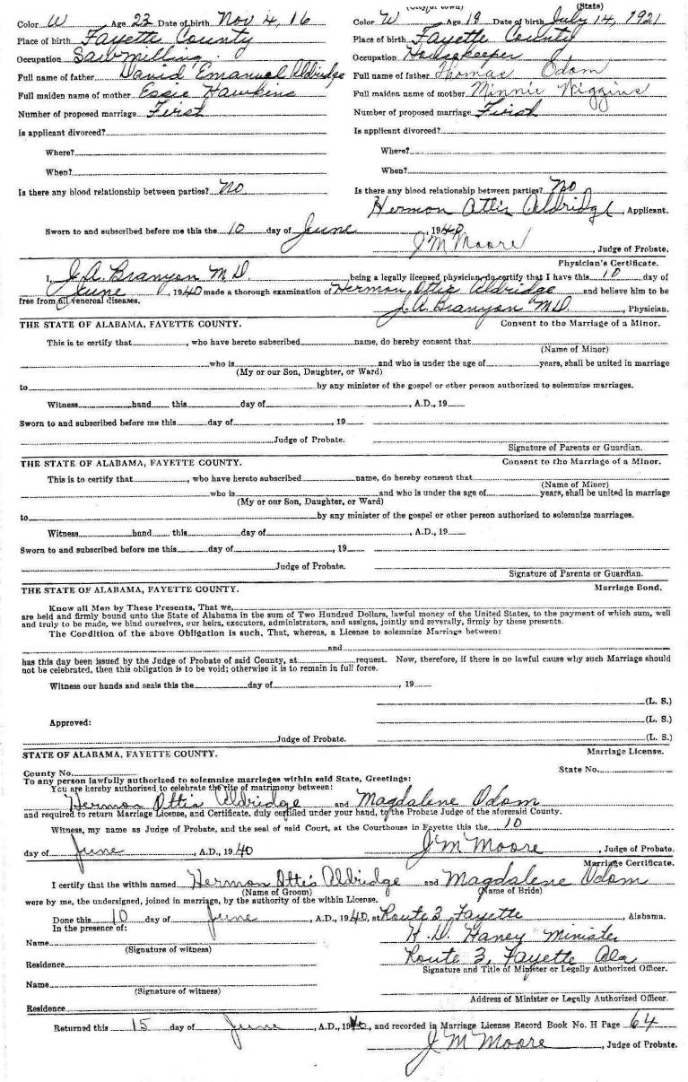 ALDRIDGE, Herman Ottis - Magdalene ODOM - 10 Jun 1940 - At Fayette Rt 3, by H.D. HANEY, Minister![]()