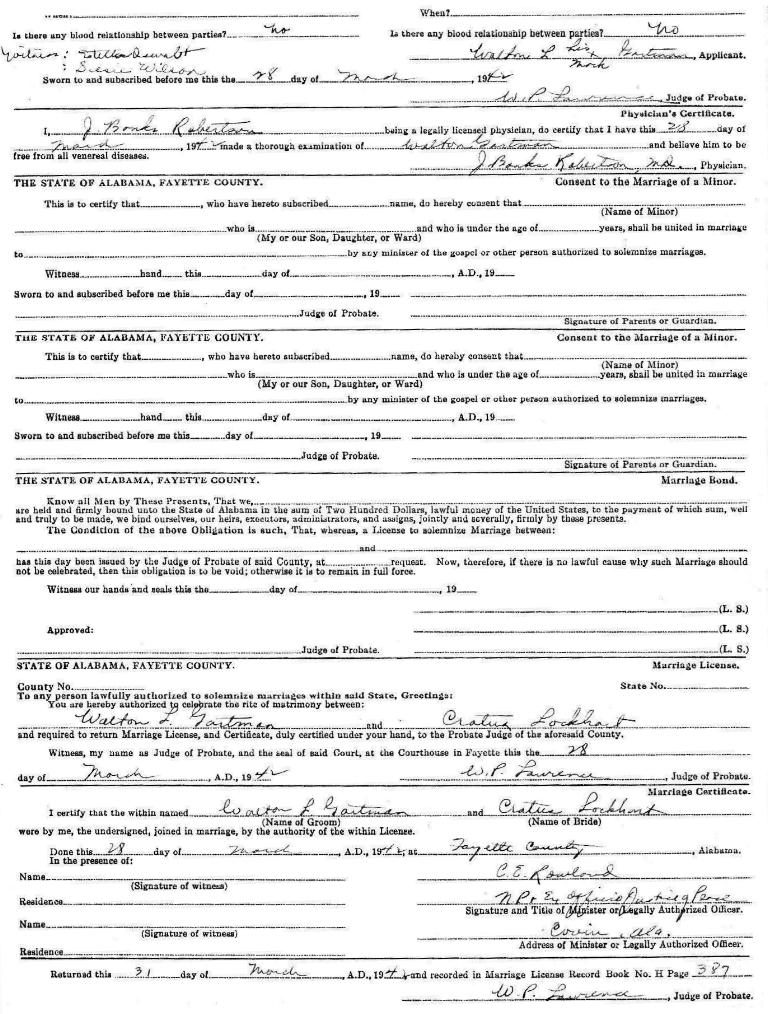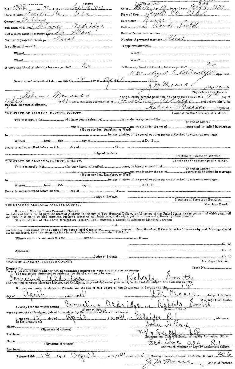 ALDRIDGE, Rengo - Imogene WEEKS - 12 Sep 1942 - At Fayette, by W.P. LAWRENCE, Judge of Probate![]()