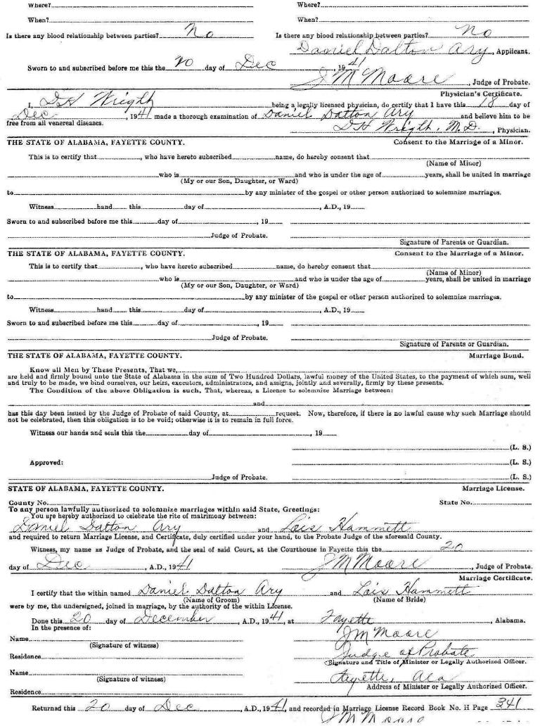 ARY, Daniel Dalton - Lois HAMMETT - 20 Dec 1944 - At Fayette, by J.M. MOORE, Judge of Probate![]()