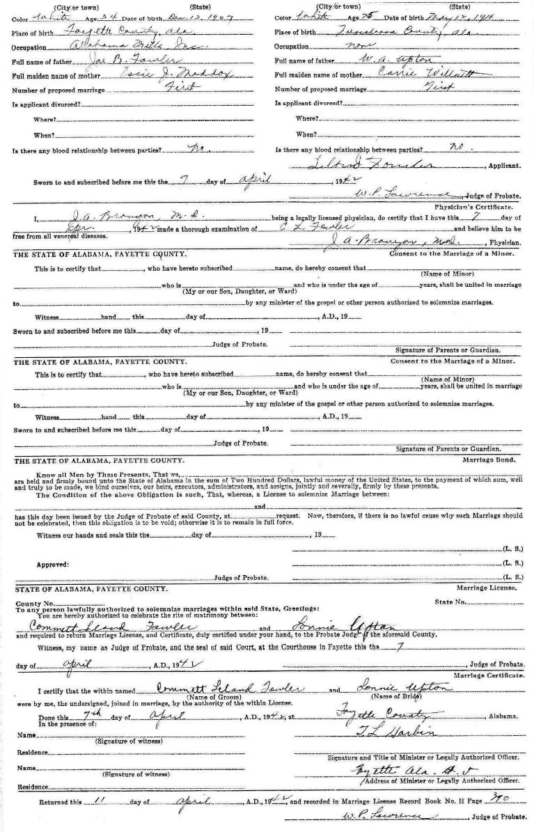 FOWLER, Emmett Leland - Lonnie UPTON - 07 Apr 1942 - At Fayette County, by T.L. HARBIN![]()