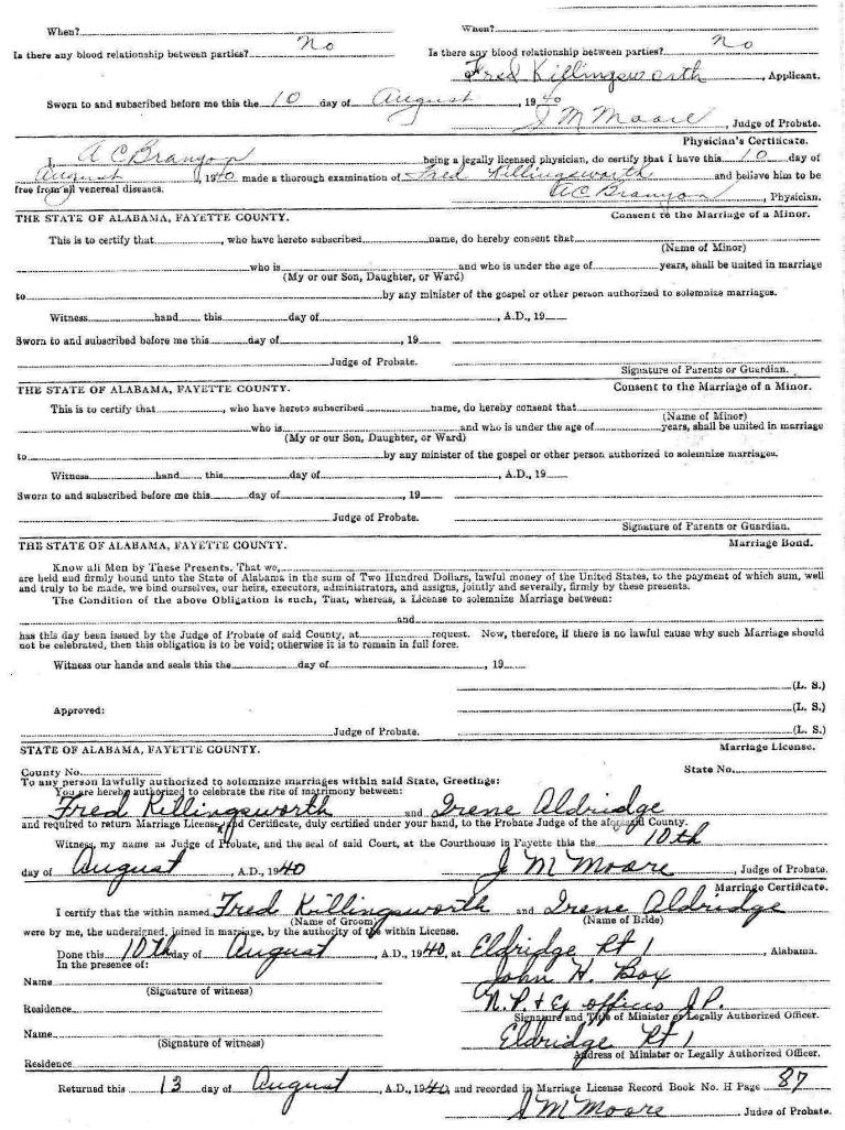 KILLINGSWORTH, Fred - Irene ALDRIDGE - 10 Aug 1940 - At Eldridge Rt 1, by John H. BOX, JP![]()