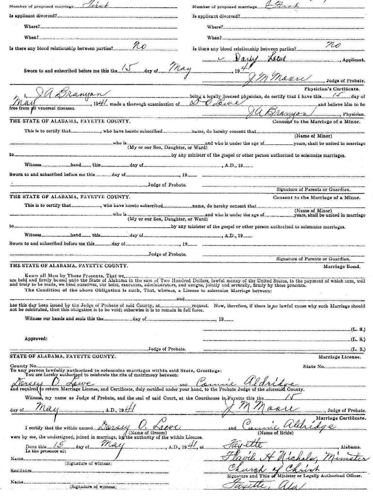LOWE, Dorsey O. - Connie ALDRIDGE - 15 May 1941 - At Fayette, by Flavil H. NICHOLS, Minister, Church of Christ![]()