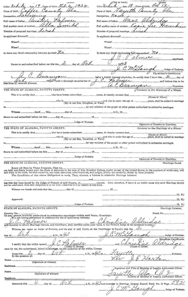 PALMER, J.C. - Christine ALDRIDGE - 02 Oct 1943 - At Fayette, by Rev. J.E. HARTON![]()