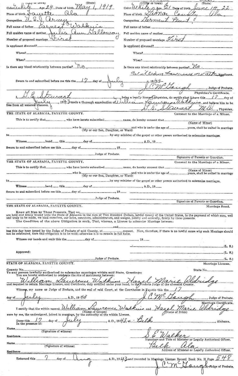WATKINS, William Lawrence - Hazel Marie ALDRIDGE - 17 Jul 1943 - At Belk, by S.E. WALKER![]()