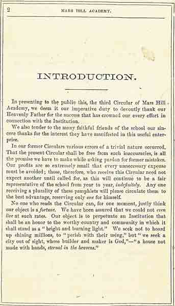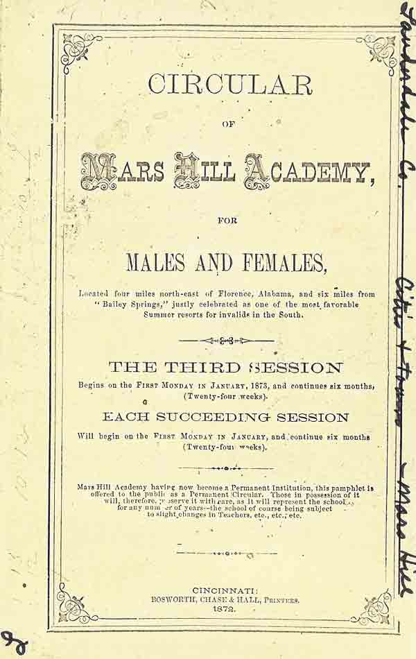 This brochure regarding Mars Hill Academy is located in the Genealogy and Local History Room of the Florence-Lauderdale Public Library. If you are on a dial-up connection, please give the pages time to load as they are larger than usual.